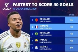 1990年以来最快达成西甲40球排名:C罗41场居首,姆巴佩42场次席
